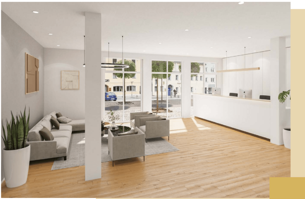 Inmitten des gepflegten Marktplatzes, angrenzend zur eindrucksvollen Pfarrei Mariä Himmelfahrt, befindet sich unser KfW Effizienzhaus 40, mit 12 Wohnungen und 2 gewerblichen Einheiten.